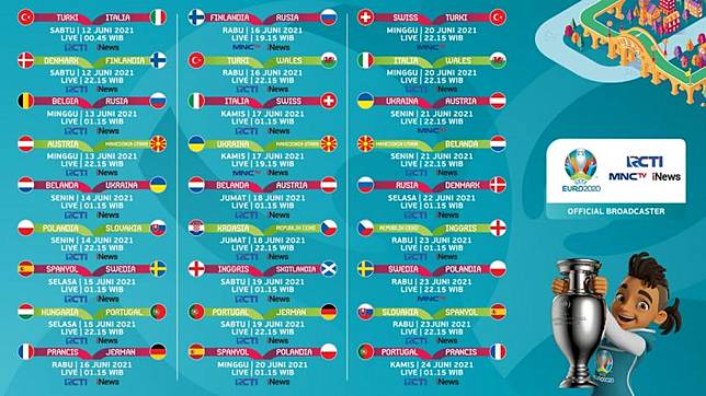 Fvns8ytsduthnm from statik.tempo.co Jadwal lengkap euro 2020, yang digelar di tahun 2021, dapat disimak di sini. Jumat, 18 juni 2021 20:00 wib swedia vs slovakia (mnc sport, mola tv) 23:00 wib kroasia vs republik cek (live sabtu, 19 juni 2021 02:00 wib inggris vs skotlandia (live rcti, inews, mola tv). Kumpulan jadwal piala eropa euro 2021, hasil pertandingan, statistik permainan, video gol pertandingan, jadwal siaran pertandingan sepakbola malam ini terlengkap hanya di sigermedia.com. Jadwal euro 2020 akan dibuka oleh duel turki vs italia di stadion olimpico, roma, pada jumat (11/6/2021) malam waktu setempat atau sabtu (12/06/2021) dini hari wib. Sebelum inggris vs skotlandia, duel kontestan grup c kroasia vs rep. Kompetisi euro diadakan pada musim panas biasanya pertengahan bulan juni hingga juli. Jadwal euro 13 juni 2021: Pertandingan pertama euro 2021 hari ini dibuka dengan swedia vs slovakia pada pukul 20:00 di stadion saint petersburg, rusia.